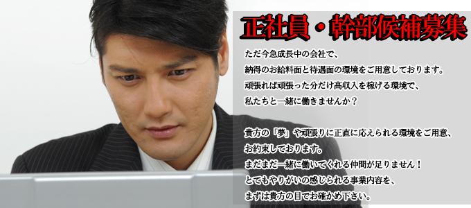 やる気のある方、誠実な方、 そして高収入を稼ぎたい方、 お店と一緒に成長を感じていきたい方、 一緒に店舗展開に携わり一緒に成長していって頂ける方、 を大歓迎・大募集しています。 経験や職歴は一切問いません。 当社の正社員・幹部候補生を大・大・大募集!! 貴方の頑張りで高収入を掴みたい方、是非ご応募下さい。 |